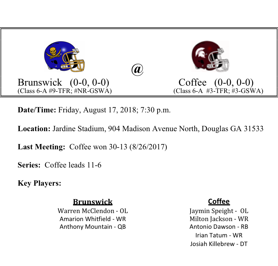 The Coffee Trojans will host the Brunswick Pirates on Friday night. Brunswick suffered several losses to graduation across the board, so lack of experience and quality depth might be a concern for the Pirates early in the season. Coffee certainly isn’t a team that you’d normally want to face to “ease into the season”. The Trojans are the Class 6A runner-up from 2017. Coffee will be replacing key starters at the skill positions as well. Antonio Dawson looks to be the heir apparent for the Coffee ground game, while Milton Jackson could give the Brunswick secondary fits on Friday night. We think that Coffee is the favorite here and we like for them to win this one by two scores.