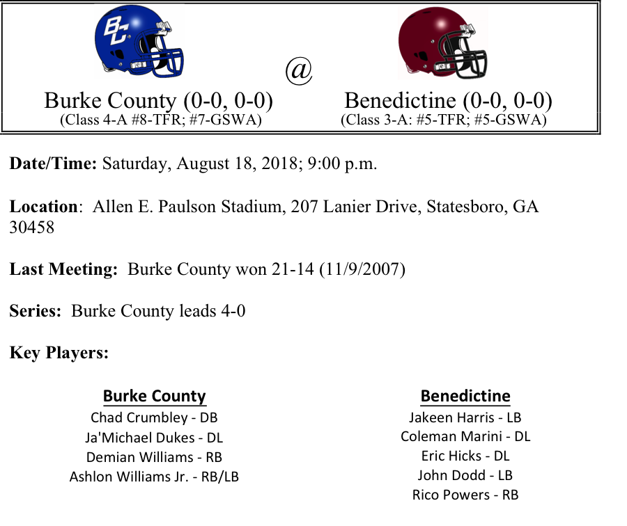 The Benedictine Cadets and Burke County Bears will close out the Erk Russell classic down in Statesboro on Saturday night. Benedictine was reclassified to 3-A in the off-season. Yet, perhaps their biggest challenge will be replacing the production of quarterback Nick Iannone and running back Travis Blackshear. Rico Powers appears set to be the feature back for the Cadets. Last season, Powers rushed for 842 yards and 11 TDs. The Cadets defensive front of Coleman Marini and Eric Hicks should create problems for opposing offenses. Jakeen Harris led the defense last season in total tackles with 103. The Burke County Bears made a deep run into the playoffs last season, but will be seeking a new quarterback, like the Cadets. Demian Williams and Ashlon Williams Jr. are two running backs that the Bears will turn to in the ground game. Even with that said, we think Benedictine will find a way to pull this one out. We like the Cadets by a field goal.