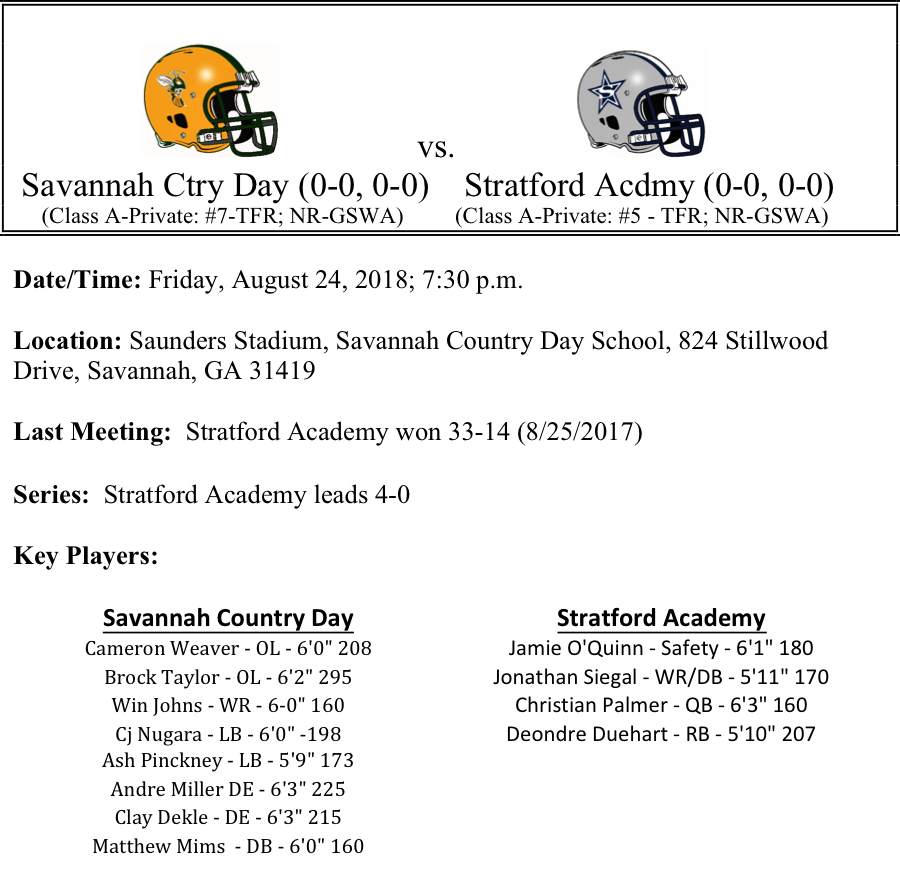 The Savannah Country Day Hornets will try to beat the Stratford Academy Eagles for the first time in five tries. The Hornets will be looking to replace All-State running back Adam Byck and four starters along the offensive line. Savannah Country Day does return three of their top receivers from last season, led by Win Johns. We won’t be surprised if quarterback Cole Gambino looks for Johns early and often.