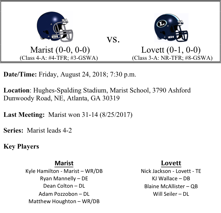The Marist War Eagles will take the field for the first time since falling to Blessed Trinity in the 2017 state title game in 4-A. The Ware Eagles won’t ease into the season as the Lovett Lions visit Hughes-Spalding Stadium on Friday night. Lovett battled a very talented Greater Atlanta Christian team till the end last week, falling 24-21, so it’s safe to say they will bring that same fight with them on Friday. Much of Lovett’s success will depend on how well quarterback Blaine McAllister controls the offense.