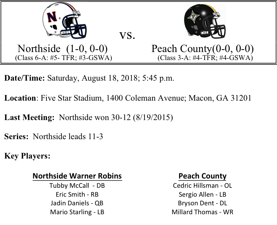 The Peach County Trojans were was off last week, but as they come into this season they will be looking to find production from the WR and RB positions as they graduated Kearis Jackson, Trevon Woolfolk and Chris Gibson. Receivers Millard Thomas and Terkel Jefferson appear ready to step in and fill some of the void left by Jackson. This game should certainly prepare the Trojans for Region play, which starts on September 21st. But Northside is a tough matchup for anyone in the state, especially this early in the season. We like Northside by two touchdowns.