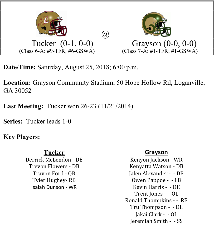 The Tucker Tigers face another of the state’s top programs as they visit the Grayson Rams on Saturday night. Tucker is coming off of a tough game last week against Buford and things don’t get any easier as they face a Grayson team that is full of players who will be playing football at the next level. The Tigers did have some bright spots on offense as they were led by quarterback Travon Ford, running back Tyler Hughey and receiver Isaiah Dunson.