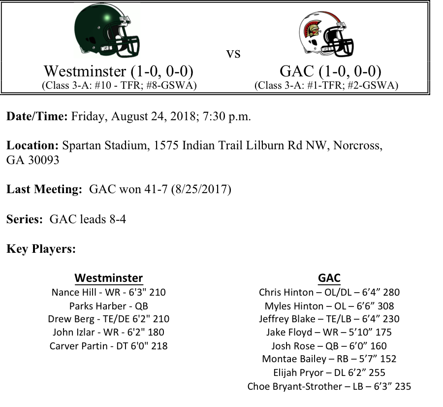 The Westminster Wildcats bring their high scoring attack to Norcross as they take on the Greater Atlanta Christian Spartans in a match-up of two class 3A powers. The Greater Atlanta Christian Spartans are highlighted by brothers Chris and Myles Hinton. These two are certainly a matchup problem for any defensive line. Last week the Spartans were led on offense by quarterback Josh Rose who used his legs and rushed for 2 TDs including the game winner from 5 yards out in the closing minutes of the game.