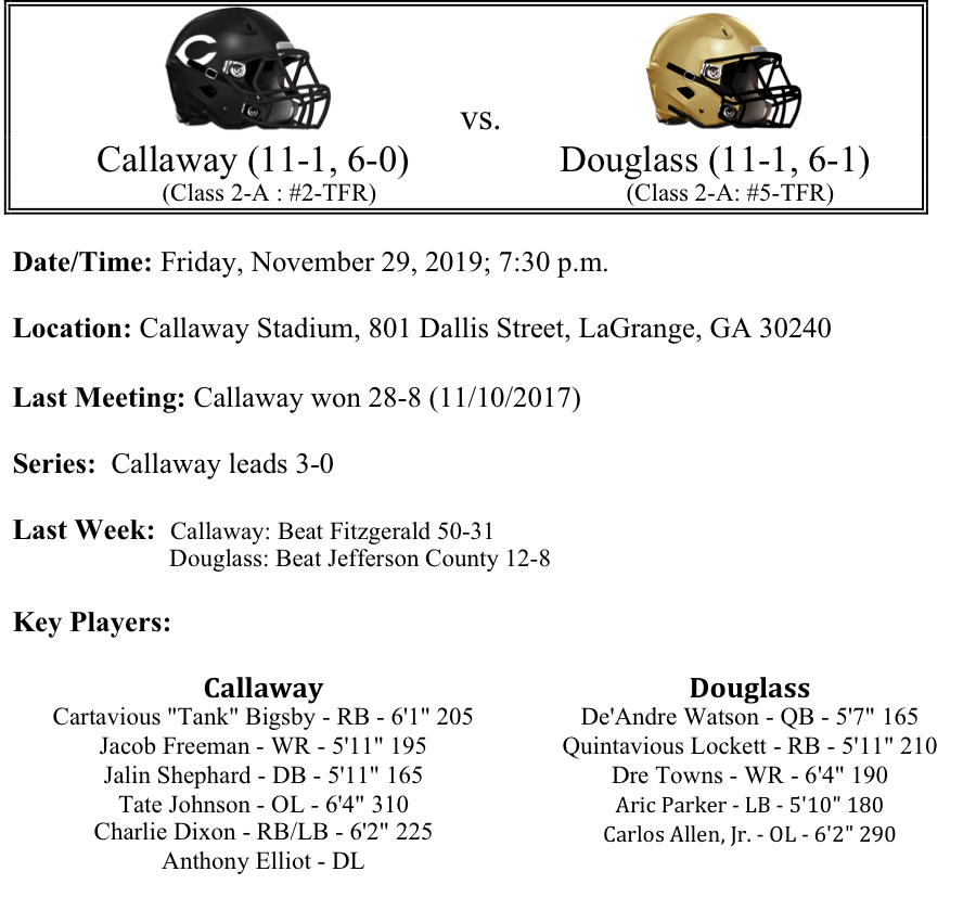 The Callaway Cavaliers have advanced to the quarterfinals for the fourth consecutive season. Callaway has won eleven consecutive games and has also scored 50 or more points in their last three games. Callaway has not lost to a team from the state of Georgia this season. In the playoffs, Callaway has outscored their opposition 104-38. The defense is allowing 10.8 points per game on the year, while the offense is averaging 43 points per game. Expect Douglass to see a steady dose of back Tank Bigsby and Charlie Dixon, but the “X-Factor” might be quarterback Demetrius Coleman. A Cavaliers win would put them into the semifinals for the third time in four years.