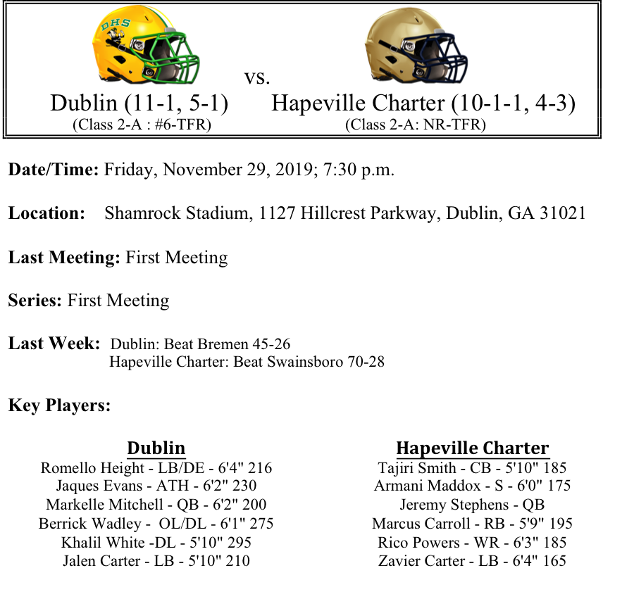 We now shift to the quarterfinal round in Class 2-A GHSA Football Playoffs. There are six #1 seeds still remaining and two #2 seed still alive. The matchups this week are Dublin-Hapeville, Thomasville-Rabun County, Metter-Brooks County and Callaway-Douglass. As always, please let us know if there are any errors. Thanks for reading and best of luck to all the teams competing this Friday night.
