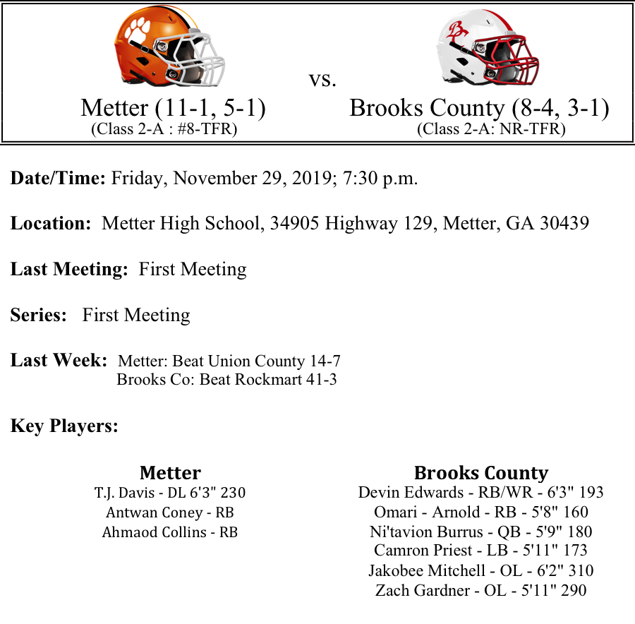 The Metter Tigers are in the quarterfinals for the first time since 2003. The Tigers have now won six consecutive games and have won eleven games for the first time since 2003. Last week, the Metter defense held the Union County passing attack in check. The Tigers are averaging 25 points per game while the defense is allowing 9.5 points per game. They have not given up more than 21 points in a game this season. A Metter win would put them in the semifinals for the first time since 2002.