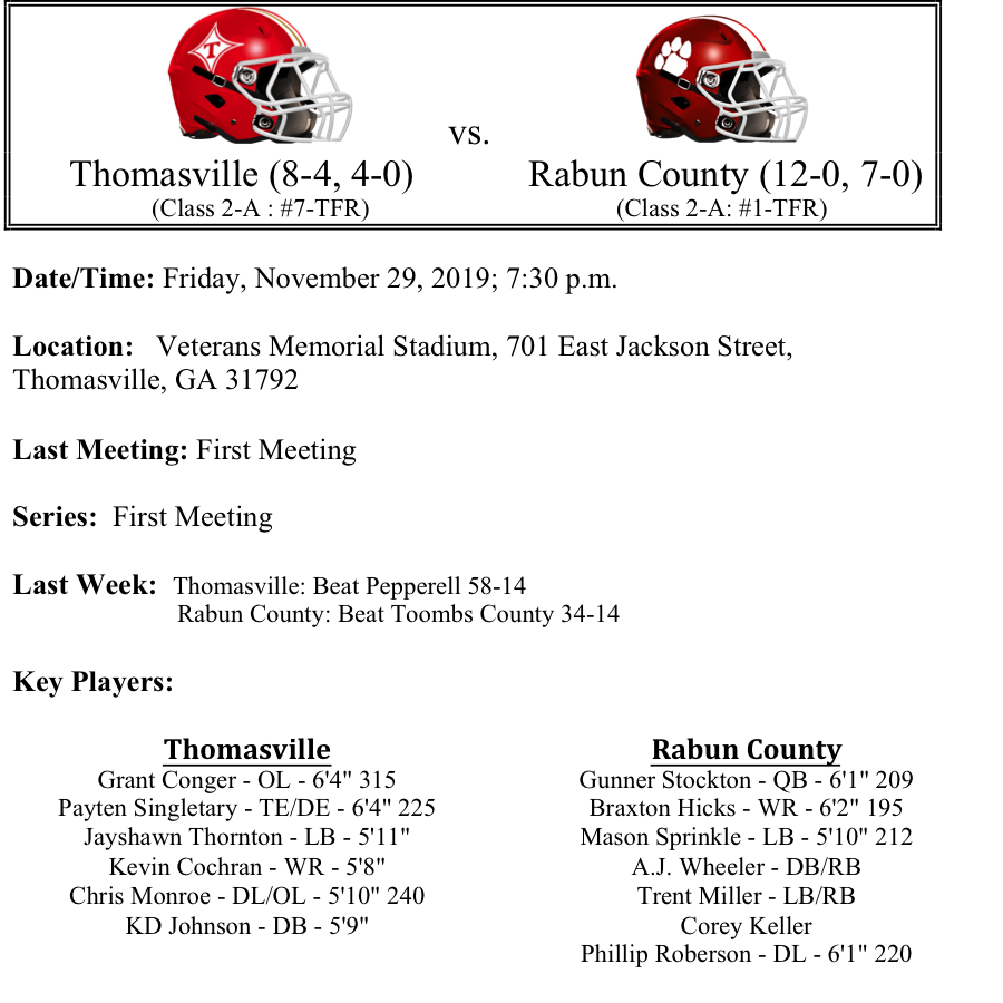 The Rabun County Wildcats have advanced to the quarterfinals for the fifth consecutive season. The Wildcats are 12-0 for the second time in school history. Quarterback Gunner Stockton has passed for 3,146 yards and rushed for 1,019 yards and accounted for 60 total TDs. Braxton Hicks is the team’s leading receiver with 59 receptions for 1,103 yards and 11-TDs. The Wildcats have not allowed over 20 points in a game this season. Phillip Roberson leads the team in sacks with 10. A win this week would put the Wildcats in the semifinals for the second time in three years. Even though Rabun County will be making the 5+ hour trip from Tiger to Thomasville, we like them this week on the road…Wildcats by 5.