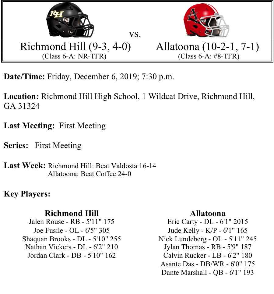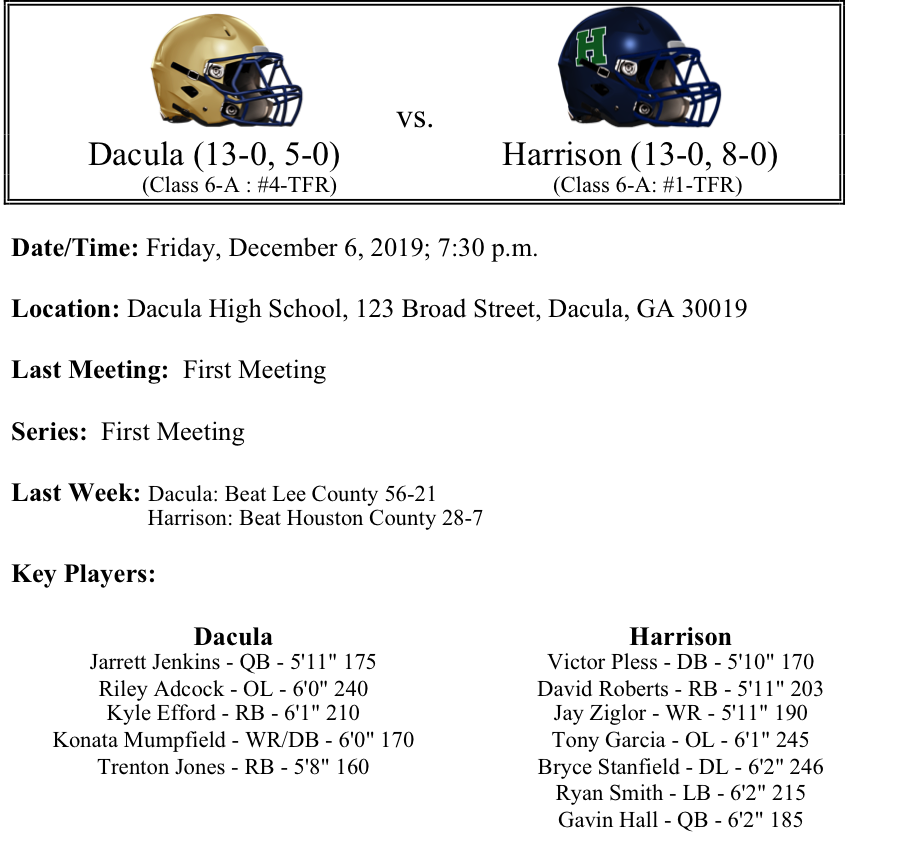 The playoff field continues to be whittled down. Up next, we preview the 6A GHSA Football semifinals. Similar to Class 7A, there are three No. 1 seeds and one No. 2 seed that make up the field for the semifinals. There are two teams from Region 6-6A (Harrison and Allatoona), still alive and if they both win, we would have an All Cobb County final. Dacula and Richmond Hill are looking to get to the finals for the first time in school history. The matchups this week are Dacula-Harrison and Richmond Hill-Allatoona. Best of luck to all teams competing this weekend. As always, please let us know if there are any corrections. Thanks as always for reading and sharing!!!