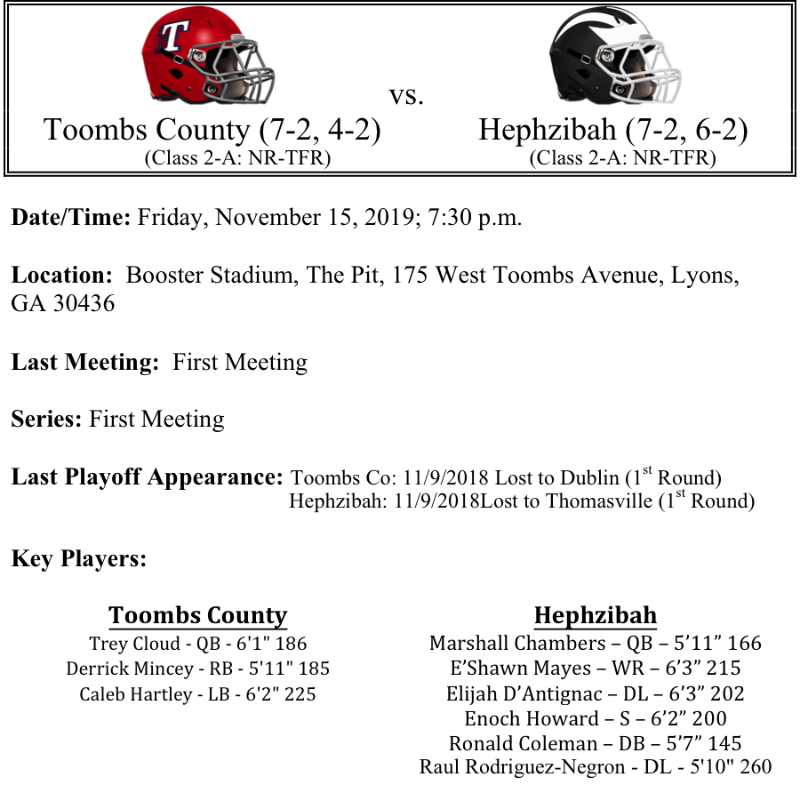 Today, we conclude our GHSA Football Playoff previews as we look at Class 2A. Matchups include Thomasville-Dodge County, Pepperell-Heard County, Rabun County-B.E.S.T Academy, and Toombs County-Hephzibah. Please let us know if there are any errors. As always, thanks for reading! Best of luck to all teams competing this week.