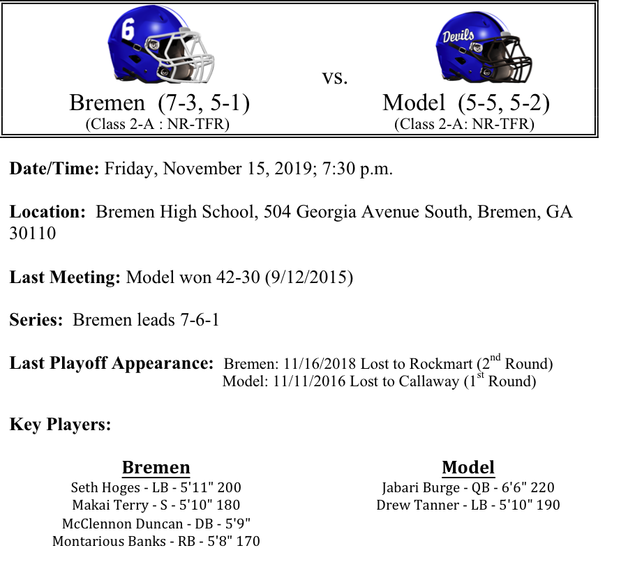 The Model Blue Devils are back in the playoffs after a two-year hiatus. Model has beaten one playoff team and had won three straight games before falling to Rockmart last week. Model is averaging 16.9 points per game while the defense is allowing 13.3 points per game. Model’s defense should keep this won close for three quarters, but we like Bremen by 10.