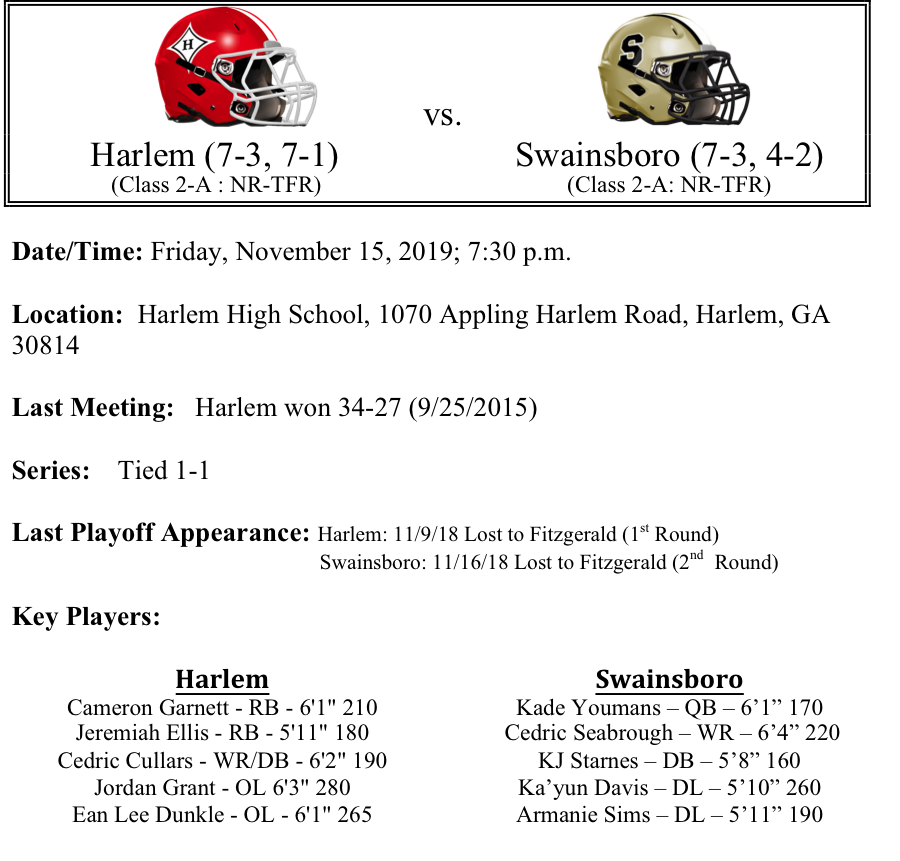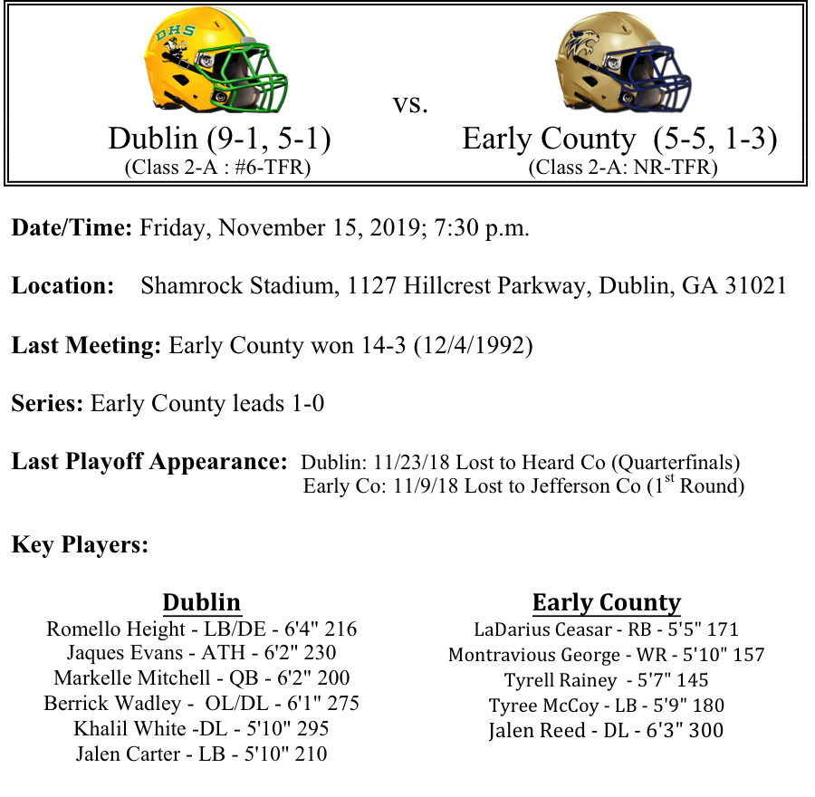 Today we conclude our GHSA Football Playoff previews as we look at Class 2A. Matchups include Dublin-Early County, Bremen-Model, Hapeville Charter-Putnam County and Harlem-Swainsboro. Please let us know if there are any errors. As always, thanks for reading! Best of luck to all teams competing this week.