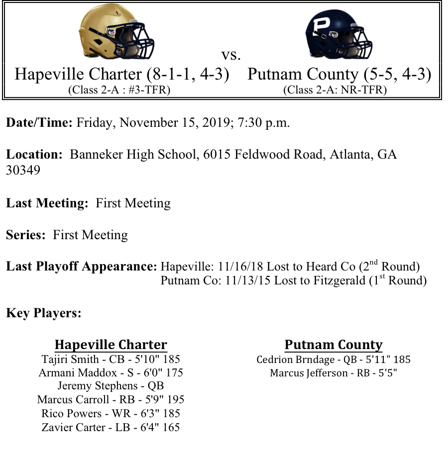 The Putnam County War Eagles are in the playoffs for the first time since 2015. The War Eagles are winners of four of their last five games heading into the playoffs. They are averaging 27.5 points per game but allowing 36.9 points. The War Eagles have not defeated a playoff team this season. Cedrion Brundage has rushed for 1,088 yards and 8-TDs to pace the Putnam County offense. Hapeville Charter’s defense should be too strong this week. We like the Hornets by five touchdown.