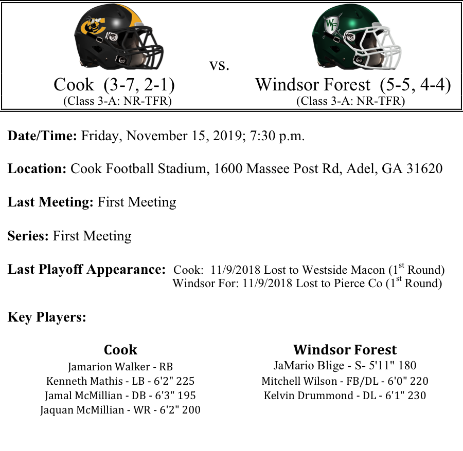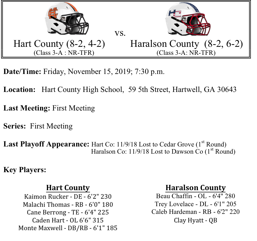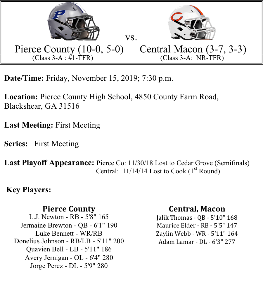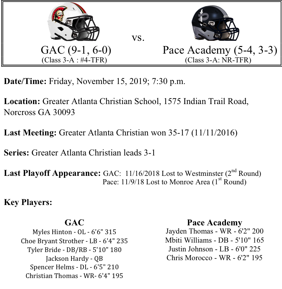 Today we continue with our GHSA Football Playoff previews as we look at Class 3A. Matchups include Greater Atlanta Christian-Pace Academy, Cook-Windsor Forest, Pierce County-Central Macon and Hart County-Haralson County. Please let us know if there are any errors. As always, thanks for reading! Best of luck to all teams competing this week.