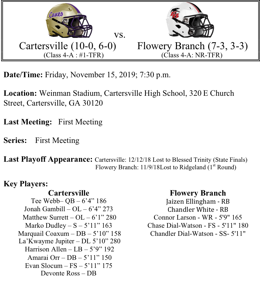 Today we continue with our GHSA Football Playoff previews as we look at Class 4A. Matchups include Cartersville-Flowery Branch, Thomson-Hardaway, Woodward-Upson Lee, and Heritage-St. Pius. Please let us know if there are any errors. As always, thanks for reading! Best of luck to all teams competing this week.