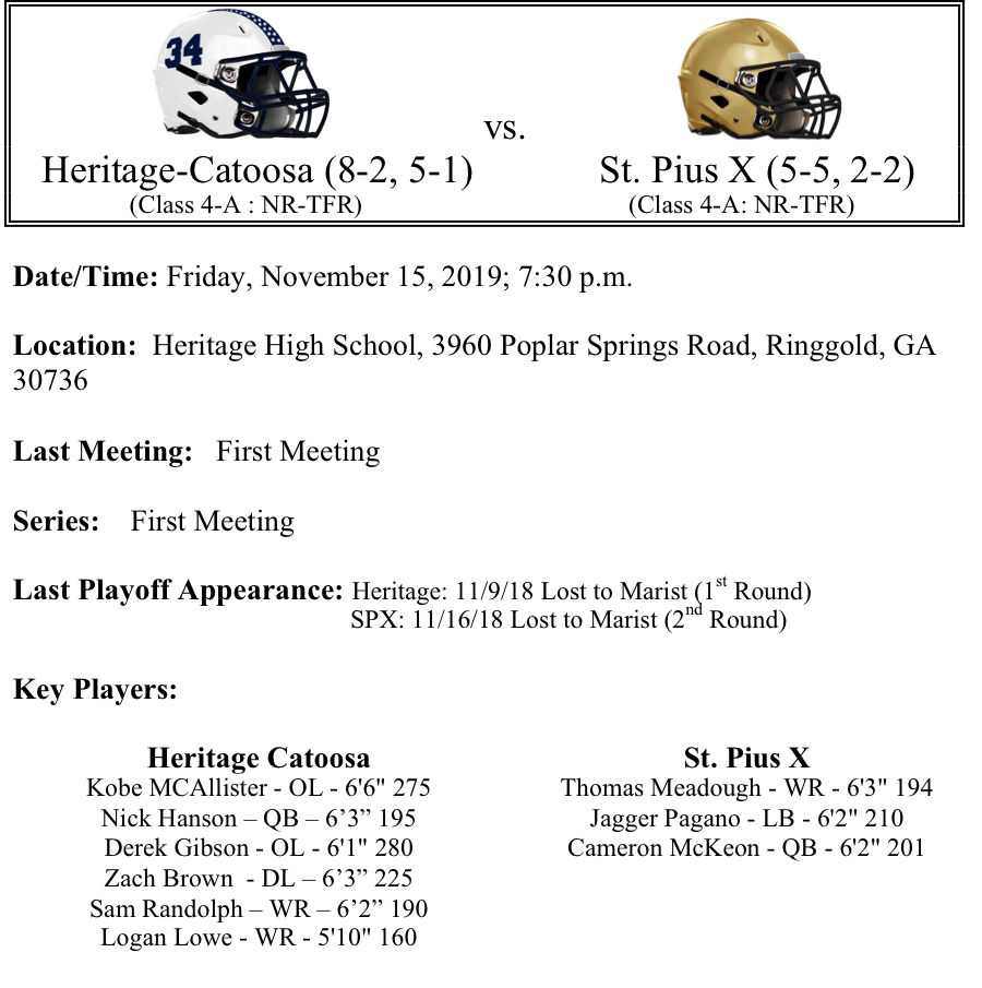 The St. Pius Lions are making their 14th consecutive playoff appearance. The Lions lost a lot of production to graduation last season. They are averaging 14.1 points per game while the defense is allowing 20.7 points per game. The Lions have beaten three playoff teams this season. We won’t ever count out Coach Standard and the Lions, but we like Heritage at home this week by a touchdown.