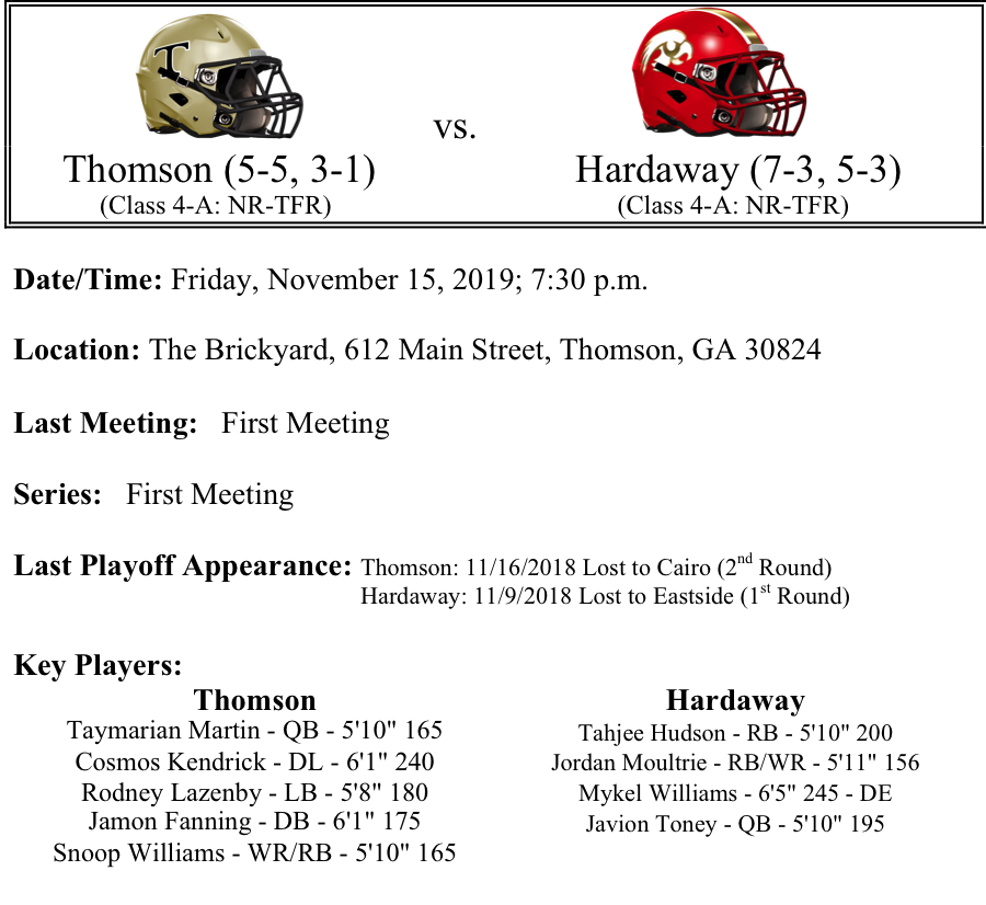 For the Hardaway Hawks, this will be their second consecutive playoff appearance. The Hawks are averaging 22.6 points per game on offense while the defense is allowing 17 points per game. Hardaway has defeated only one teams that qualified for the playoffs. We like Thomson by a touchdown this week.