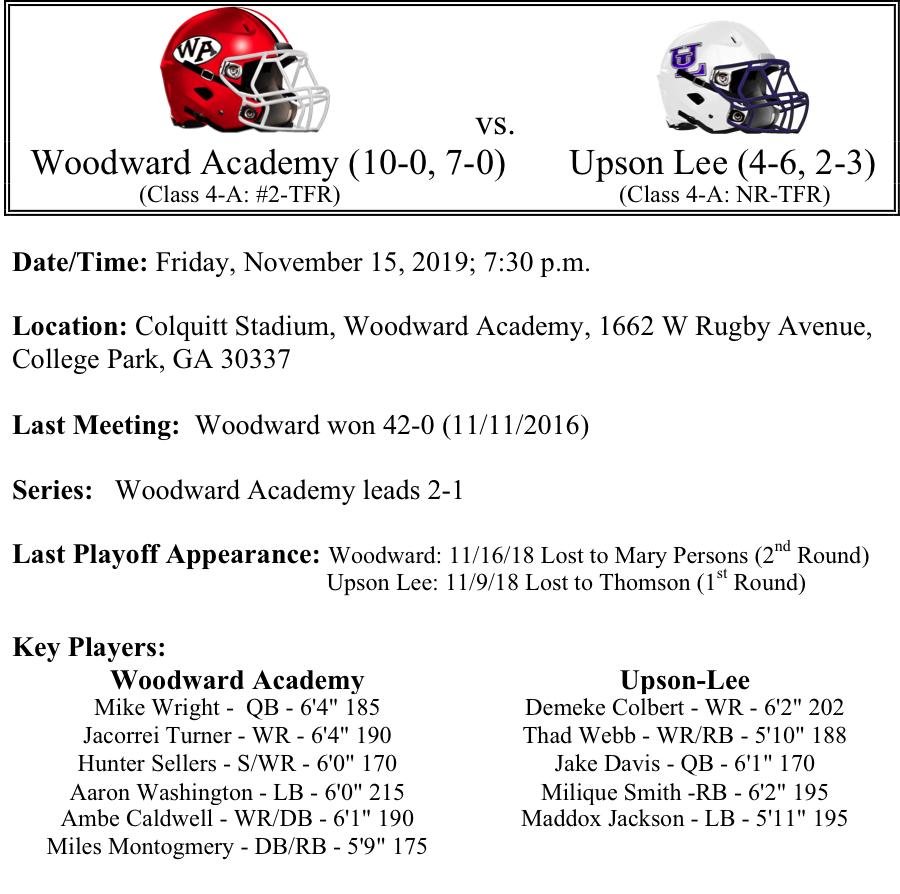Upson Lee returns to the post season for the 4th time in 5 years. The Knights deepest playoff run was back in 1993 when they made it to the quarterfinals. Upson Lee is averaging 19.2 points per game on offense while the defense is allowing 28.4 points per game. Quarterback Jake Davis has passed for 1,321 yards and 8-TDs and Thad Webb has 33 receptions for 479 yards and 2-TDs. We believe Woodward has too many weapons and expect them to win big this week. War Eagles by four touchdowns.
