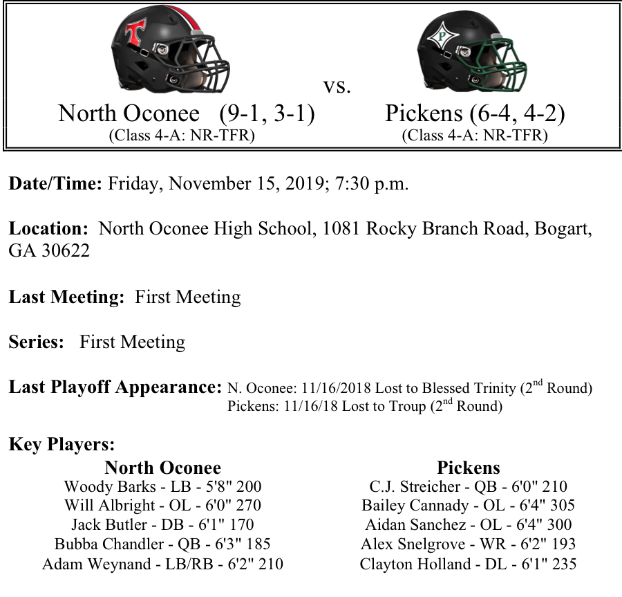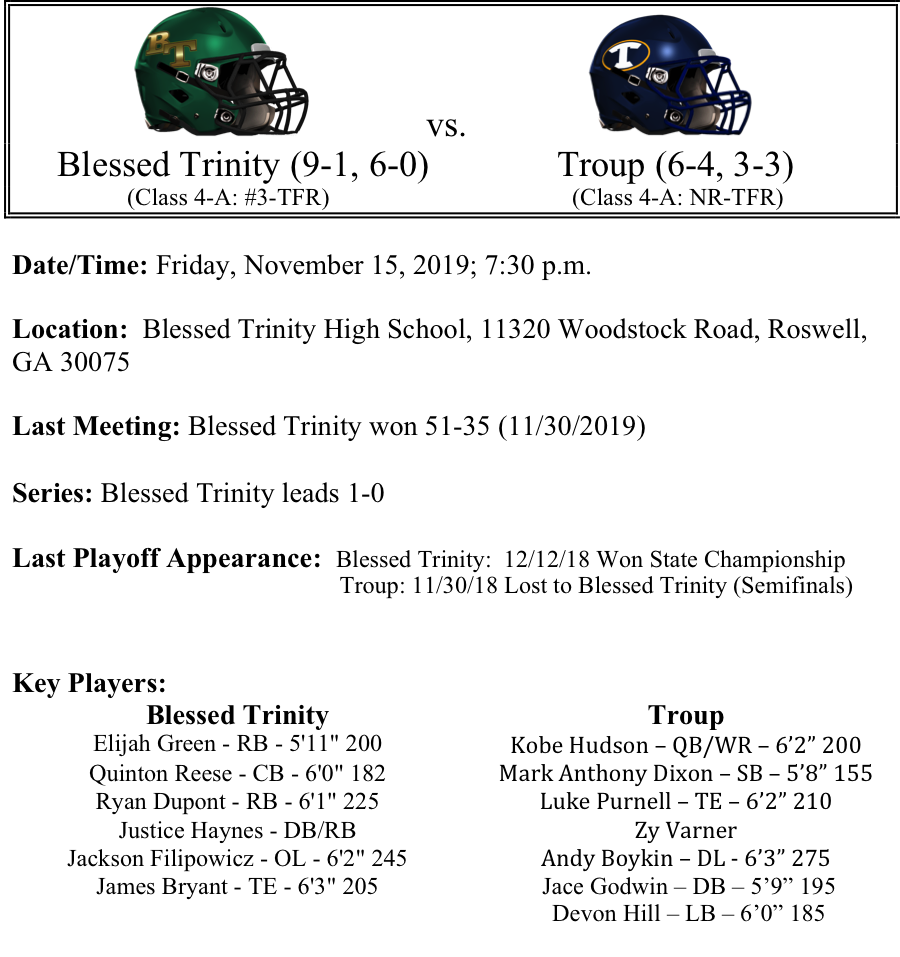 Today we continue with our GHSA Football Playoff previews as we look at Class 4A. Matchups include Blessed Trinity-Troup, Cairo-Baldwin, West Laurens-Luella and North Oconee-Pickens. Please let us know if there are any errors. As always, thanks for reading! Best of luck to all teams competing this week.