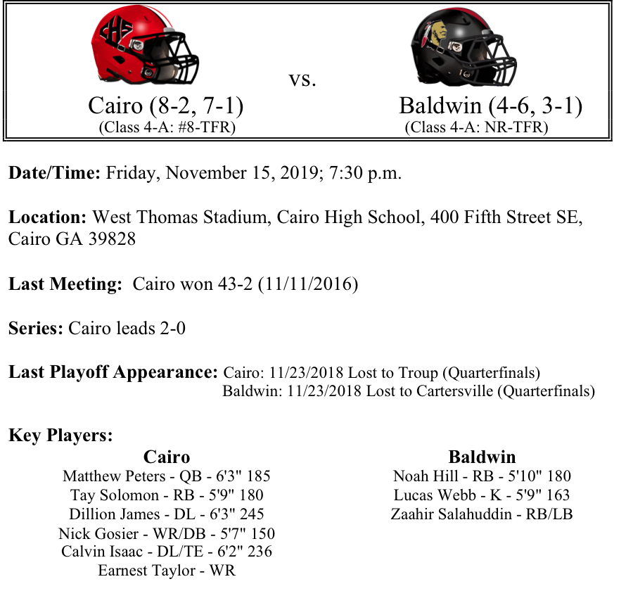 The Cairo Syrupmakers are no stranger to post season play. Since 1989, Cairo has only missed the playoffs 4 times. Cairo narrowly missed out on their second consecutive region title after losing to Carver-Columbus earlier this season. The Syrupmakers are averaging 37.4 points per game on offense while the defense is allowing 13.4 points per game. Quarterback Matthew Peters has passed for 1,197 yards and 15-TDs, while Tay Solomon has rushed for 662 yards and 10-TDs. Matthew Peters has added 603 yards and 7-TDs.
