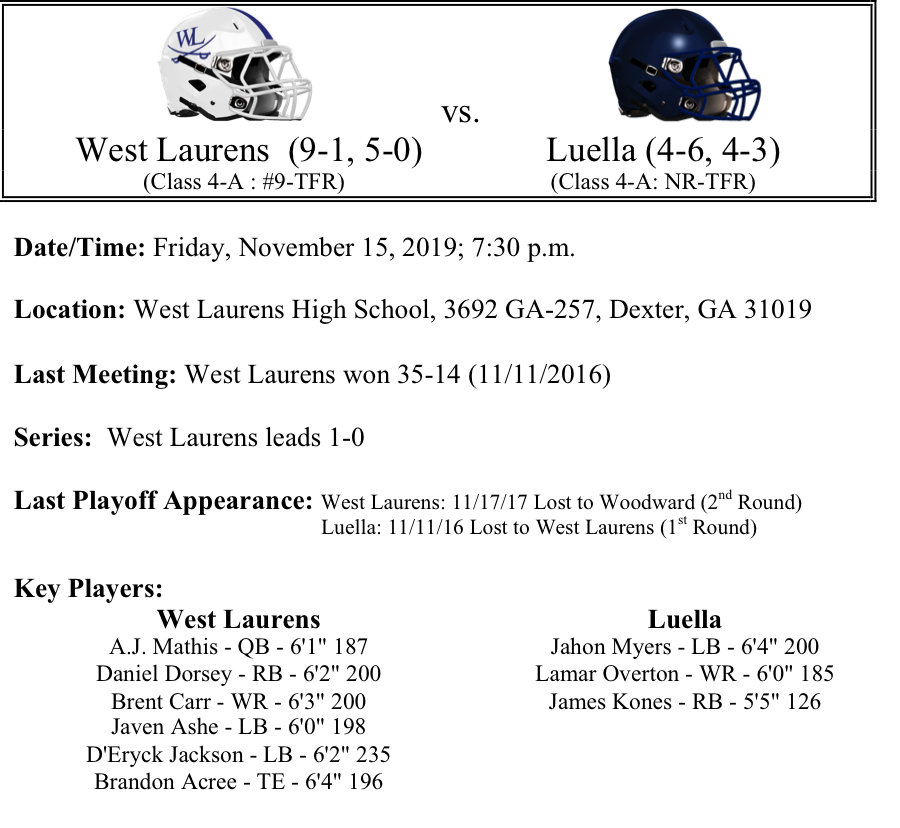 The Luella Lions are back into the playoffs for the first time since 2016. The Lions area averaging 13.1 points per game while their defense is allowing 19.8 points per game. The Lions have not defeated a playoff team this season. These two teams met back in the first round of the 2016 season. We like West Laurens this week perhaps by a similar margin to the 2016 game. Raiders by 21.