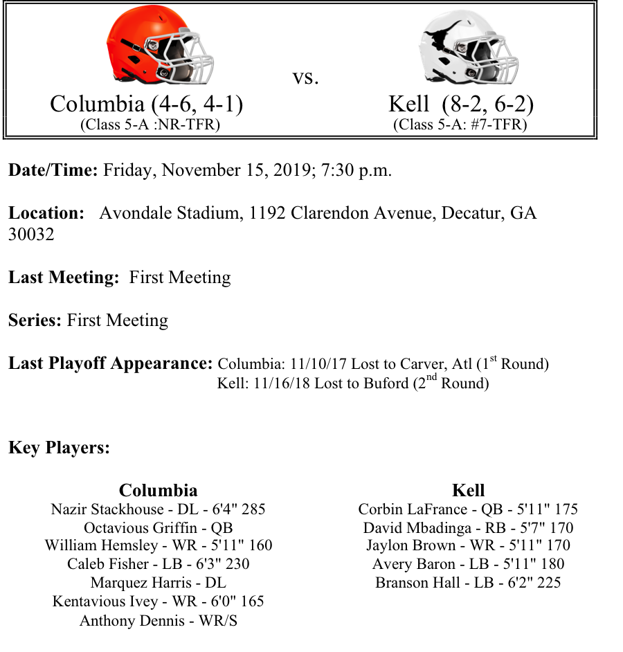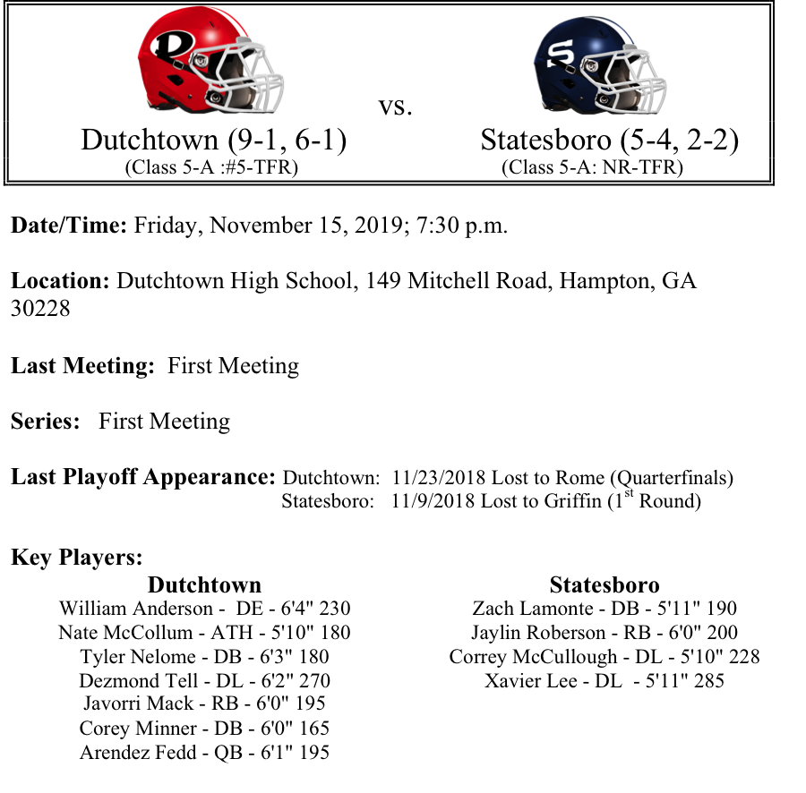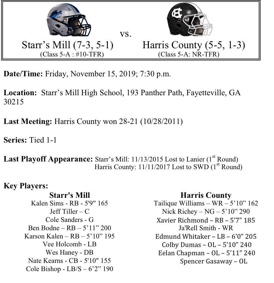 Today we continue with our GHSA Football Playoff previews as we look at Class 5A. Matchups include Starr’s Mill- Harris County, Columbia-Kell, Riverwood-Loganville and Dutchtown-Statesboro. Please let us know if there are any errors. As always, thanks for reading! Best of luck to all teams competing this week.
