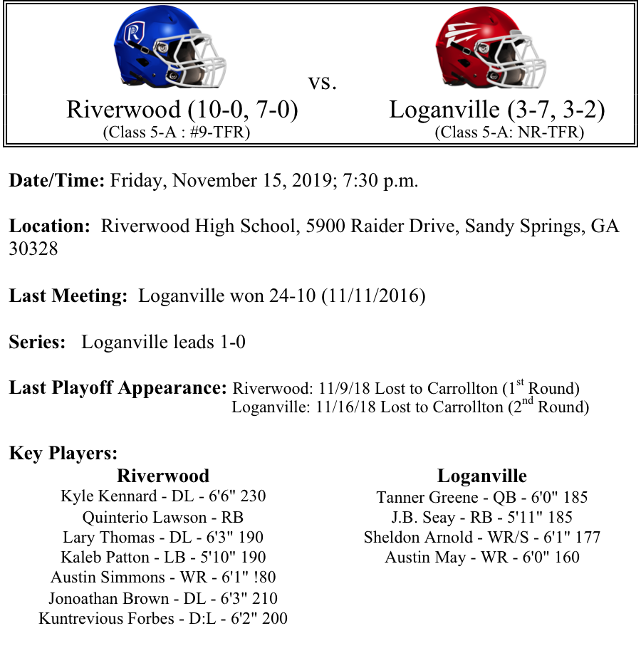 The Loganville Red Devils are back in the playoffs for the fourth time in five years. Last year, as a number four seed, the Red Devils shocked Southwest DeKalb in the first round. This season, Loganville is averaging 20.1 points per game while the defense is allowing 21.4 points per game. Quarterback Tanner Greene has passed for 1,487 yards and 11-TDs this season. We like Riverwood in this matchup by three touchdowns.