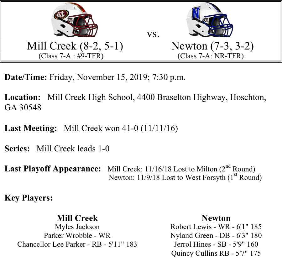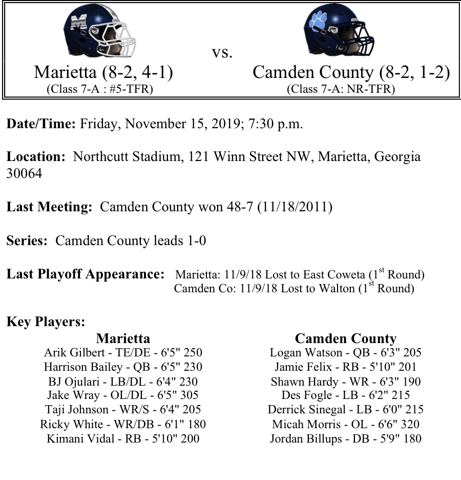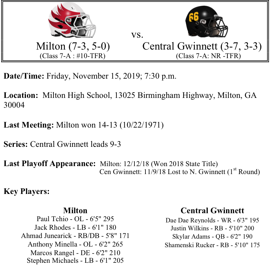 Today we begin our previews of the first round of the GHSA Football playoffs. In this edition, our Class 7A previews feature Milton-Central Gwinnett, Marietta-Camden County, Roswell-Wheeler and Mill Creek-Newton. As always, thank you for reading. Please feel free to share and let us know if there are any errors. Best of luck to all teams competing in the playoffs.