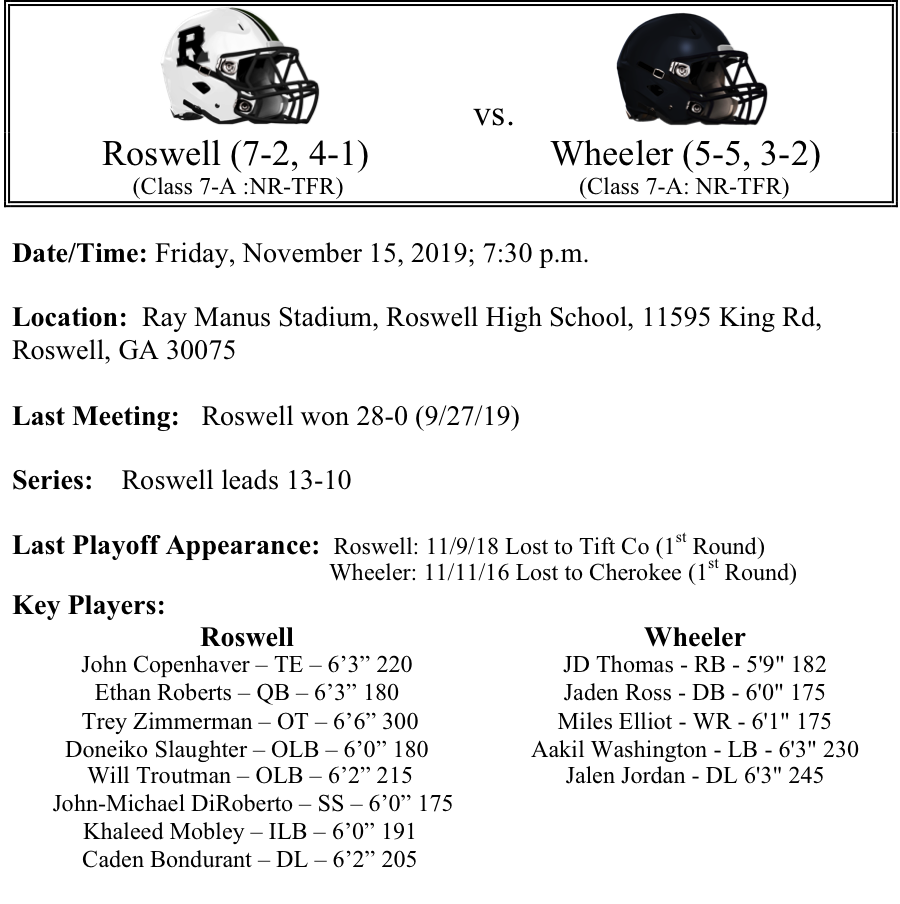 The Roswell Hornets won the Region 4-7A title and now host the Wheeler Wildcats. The two teams met earlier this season with Roswell shutting out Wheeler 28-0 back in September. The Hornets are winners of their last four games and are averaging 31.5 points per game while allowing only 10 points per game.