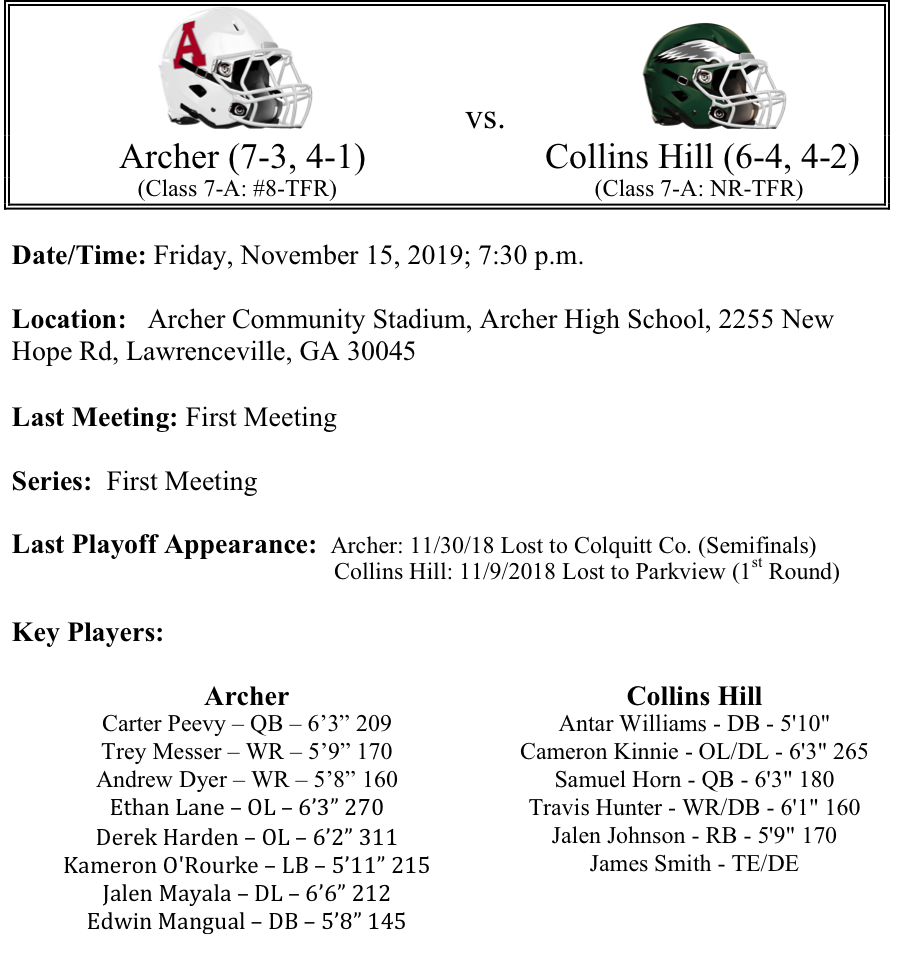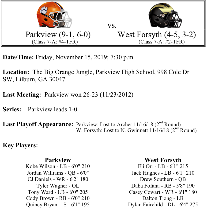Today we begin our previews of the first round of the GHSA Football playoffs. In this edition, our Class 7A previews feature Parkview-West Forsyth, Colquitt County-North Cobb, Westlake-Cherokee and Archer Collins Hill. As always, thank you for reading. Please feel free to share and let us know if there are any errors. Best of luck to all teams competing in the playoffs.