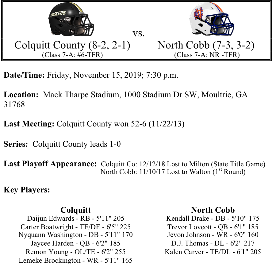 Head Coach Shane Queen has his North Cobb Warriors back in the playoffs after missing out on the post season last year. The Warriors scored a big win last week over Hillgrove, their only win over a top-10 ranked team this season. North Cobb is averaging 33 points per game while the defense is allowing 21.5. This game should be a high scoring contest, but we believe Colquitt holds serve on their home field. Pack by 17.