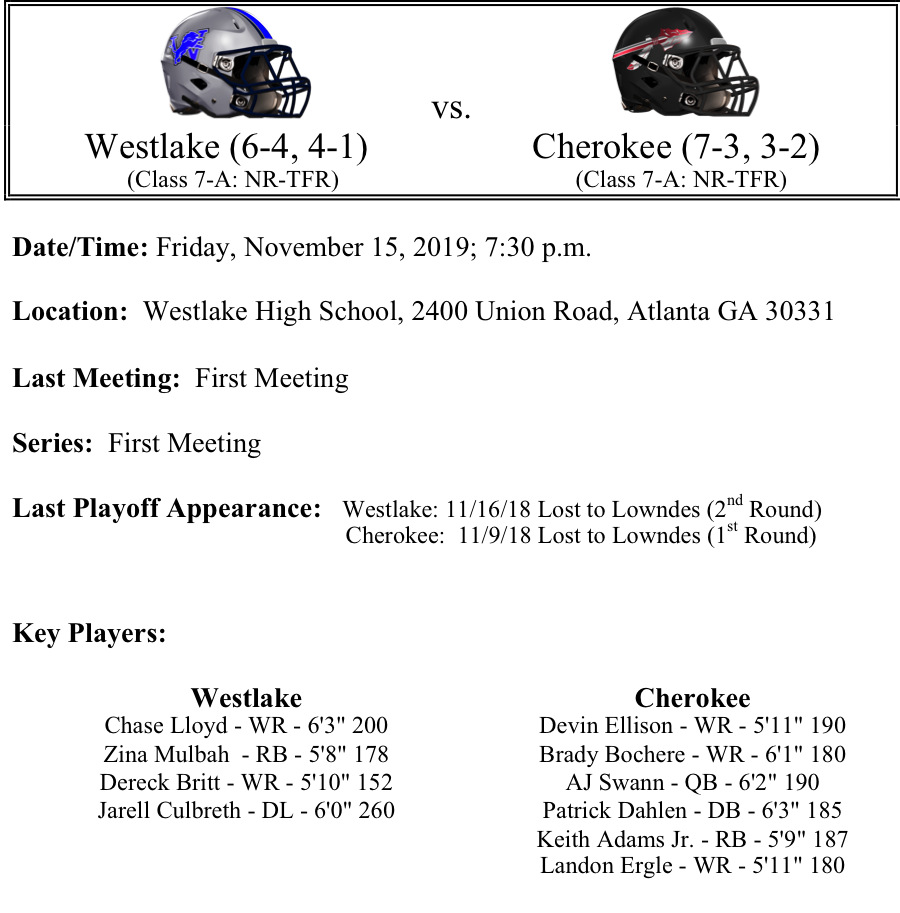 The Westlake Lions won their 6th consecutive Region title this season and are making their 7th consecutive playoff appearance. The Lions are averaging 26.5 points per game and allowing 21.8 points per game. Their only region loss was a surprising 3-point loss to Wheeler.