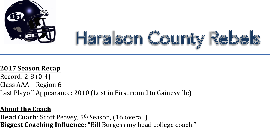 Head Coach Scott Peavy is in his second season as the head coach for the Haralson County Rebels. Coach Peavey previously had a three-year stint at Haralson from 2002-2004. The Rebels play in an extremely competitive region with the likes of defending state champion Calhoun, and the up and coming Adairsville and Sonoraville programs.