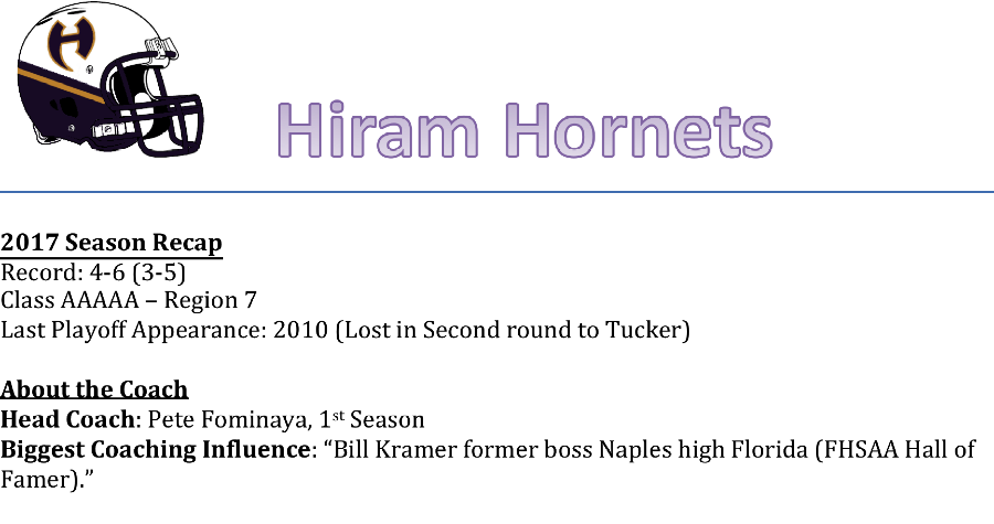 Coach Pete Fominaya takes over as the head Coach for the Hiram Hornets this season. This will be Fominaya’s first head coaching job. He inherits a Hiram team that has gone 4-6 in the last two seasons and has not been to the playoffs in eight seasons. Coach Fominaya does have some talent to work with this season. But as a first year coach, there are several challenges.