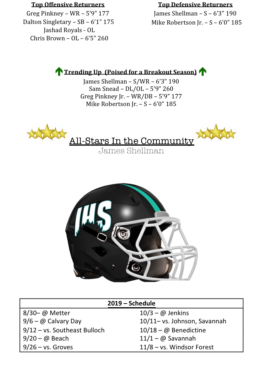 The Sharks offense will be anchored by linemen Jashad Royals (2018 All-Region selection) and Chris Brown, while Greg Pinkney Jr. and Dalton Singletary will provide depth at wide receiver.