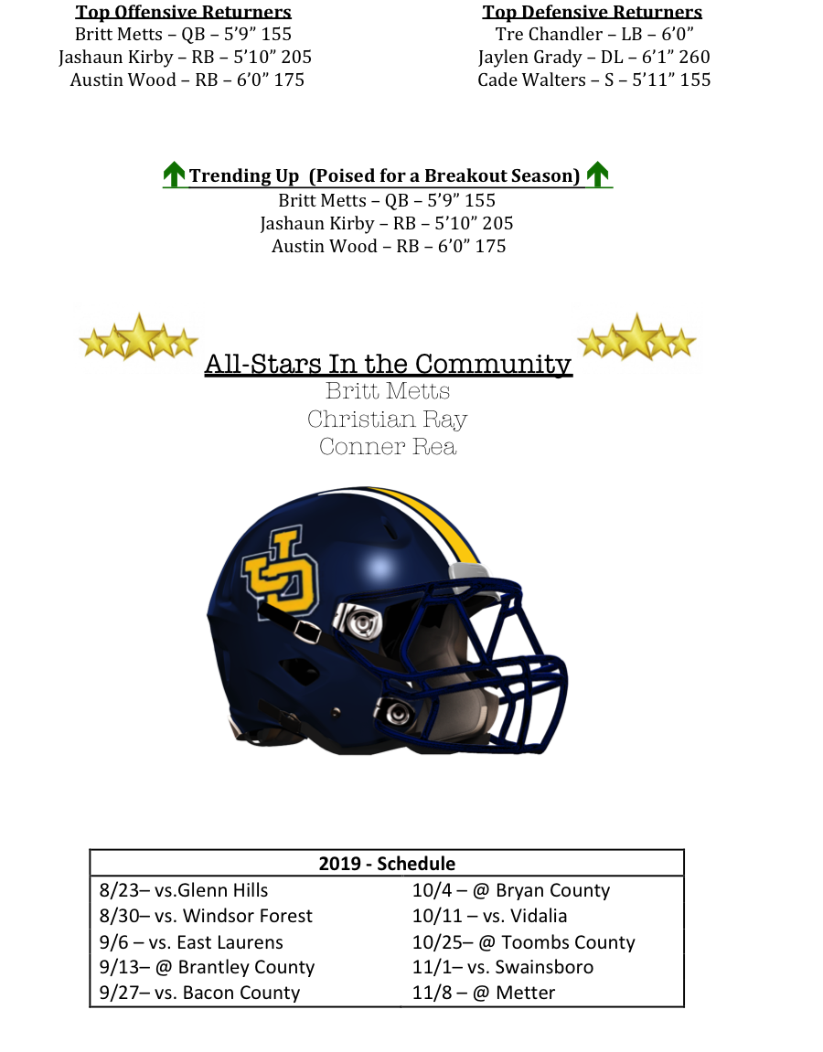 The Jackets return two All-Region performers on the offensive line, Jaylen Grady and Christian Ray. They will be tasked with creating running lanes for Jashaun Kirby and Austin Wood. Both backs were All-Region selections in 2018 along with All-Region QB, Britt Metts.