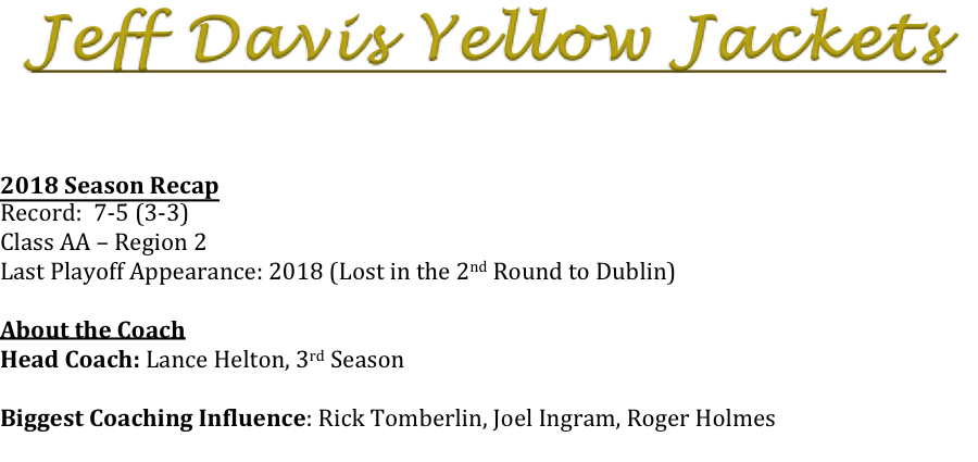 Coach Lance Helton is now in his third season as head coach for the Jeff Davis Yellow Jackets. Coach Helton has led the Yellow Jackets to the post season in both of his previous seasons. As the 2019 approaches, we asked Coach Helton what the biggest challenge was this season.