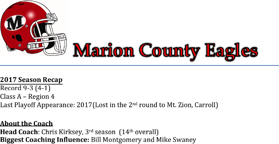 The Marion County Eagles have qualified for post-season play in nine consecutive seasons. Coach Chris Kirksey is in his third season at Marion County and looks to continue the success that the Eagles have enjoyed. Coach Kirksey describes the biggest challenge that he and his staff faces coming into the new season.