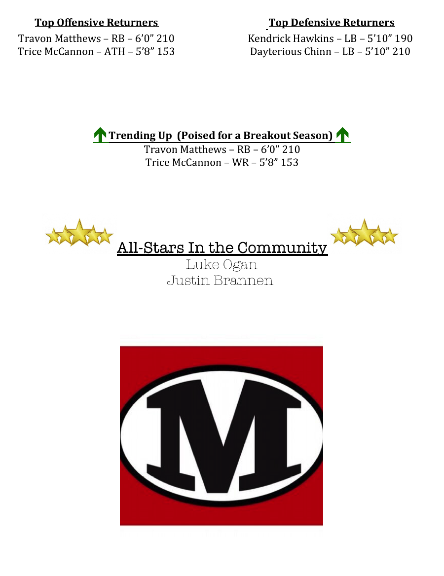 The Eagles offense will certainly revolve around two of their leading skill position players, Trice McCannon and Travon Matthews. Matthews was a 2017 All-State Honorable Mention selection at running back. He rushed for over 1,500 yeards and 25 TDs. McCannon is another playmaker for the Eagles that can line up at WR, QB or in the backfield. McCannon was second on the team in rushing with almost 800 rushing yards and 6 TDs.