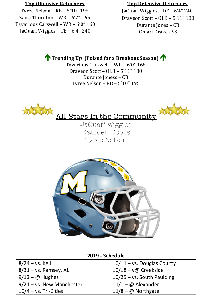 The aforementioned Wiggles doubles as one of the top defensive lineman in region 5-6A. He recorded 9 sacks last season for the Raiders. Linebacker Draveon Scott and safety Omari Drake return as two of the top tacklers from a year ago. Scott recorded 41 solo tackles while Drake netted 42. Durante Jones will add depth in the secondary for Mays.