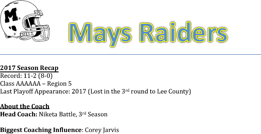 The Mays Raiders are the defending 5-6A champion. They made an impressive run into the quarterfinals. But Coach Niketa Battles knows that this season presents it’s own set of challenges. We asked Coach Battle about the biggest challenge he and his staff faces coming into 2018