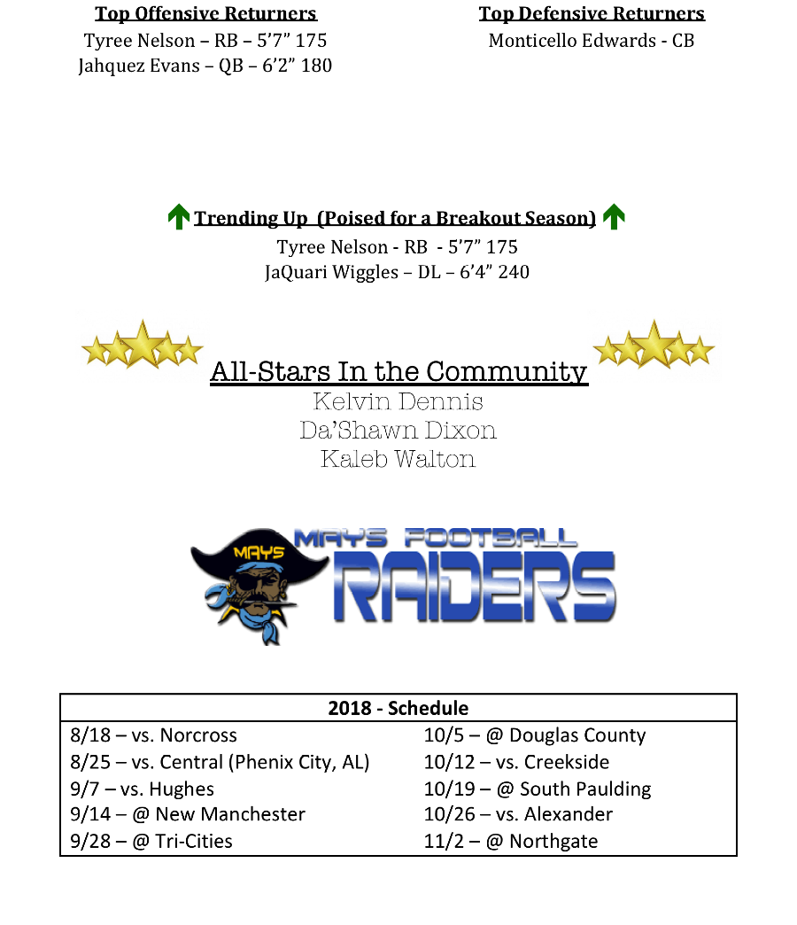 Coach Battle told us, “Every game is a State Championship Game,” when we asked if there was a game circled on the schedule. The Raiders certainly aren’t easing into the 2018 season as they are set to take on perennial power Norcross in the Corky Kell Classic on Saturday, August 18th.