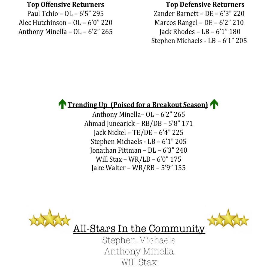 The Eagles will be breaking in new players at the skill positions. Ahmad Junearick is the leading returning rushing from a year ago. Last season Junearick rushed for 329 yards and 2-TDs. Will Stax and Jake Walter are the teams returning receivers with experience. Expect to see Junearick, Stax, and Walter to see a lot more action in 2019 with the graduation of a talented senior class.