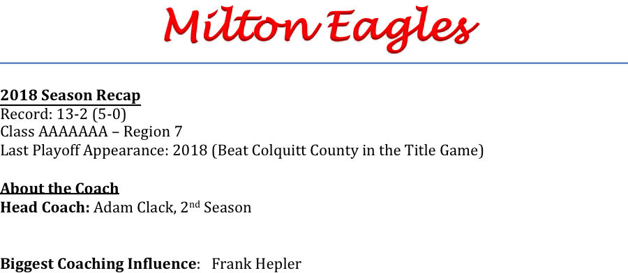 2018 was a historic season for the Milton Eagles as they won the first state title in school history, in Coach Adam Clack’s first season as head coach. While we are sure there is still a buzz in the hallways at Milton and in the community, Coach Clack and his staff know that there are new challenges in 2019.