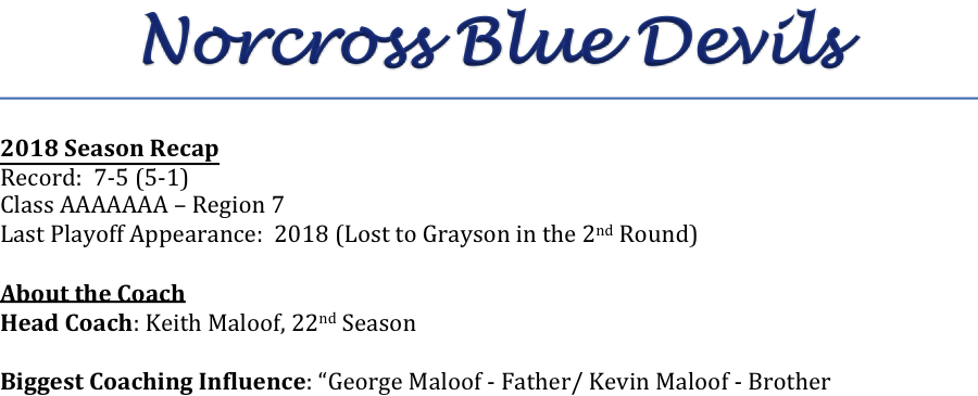 The Norcross Blue Devils look to extend their consecutive playoff appearance streak to 10 seasons in a row. Coach Keith Maloof has been at the helm for the Blue Devils since 1999. While the Blue Devils will have their work cut out for them on the field, when we asked Coach Maloof what the teams biggest challenge was, he replied,