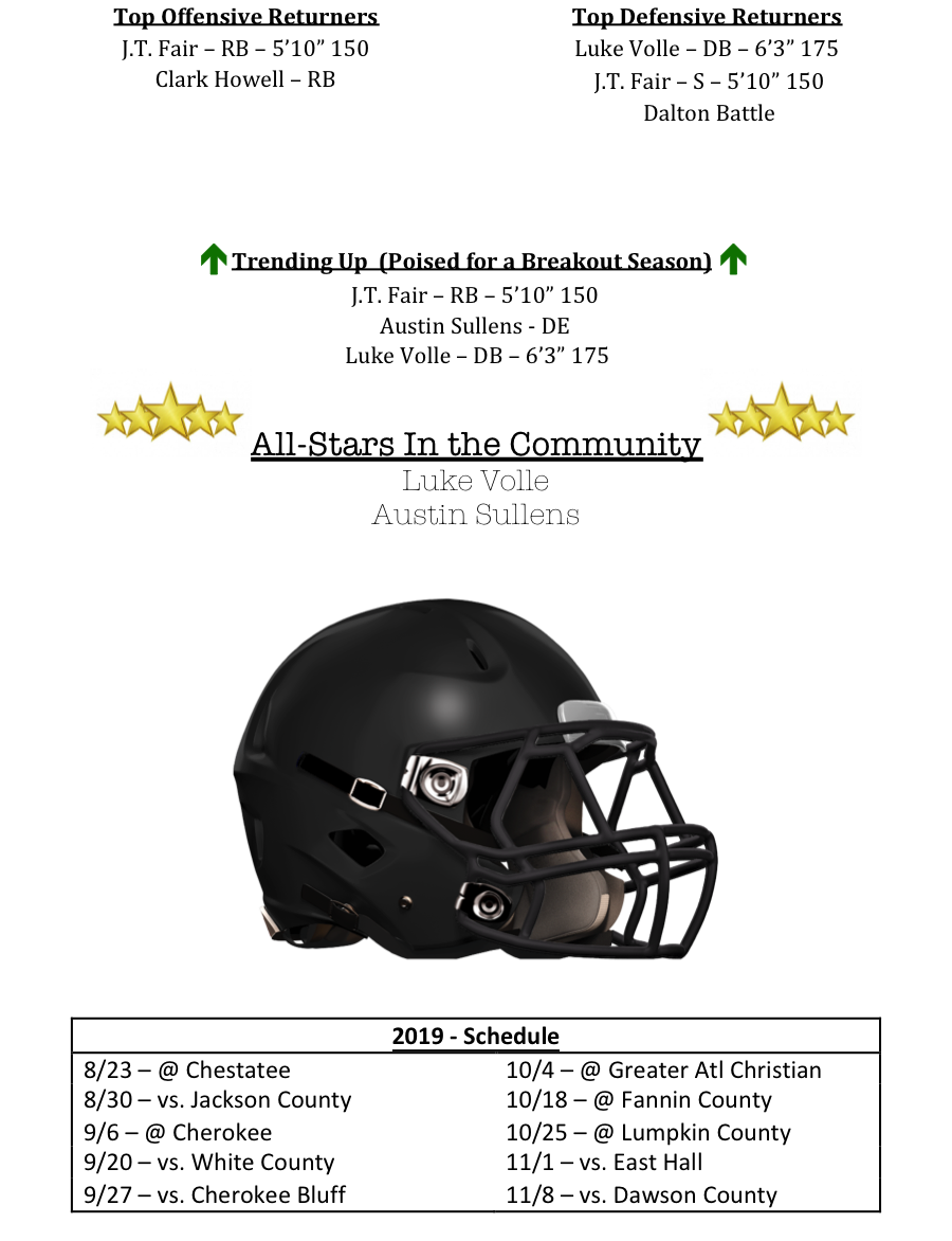 Defensively, Luke Volle and Austin Sullens were All-Region selection in 2018. Volle led the team in interceptions with 3 in 2018. The aforementioned Fair will also see time at safety.
