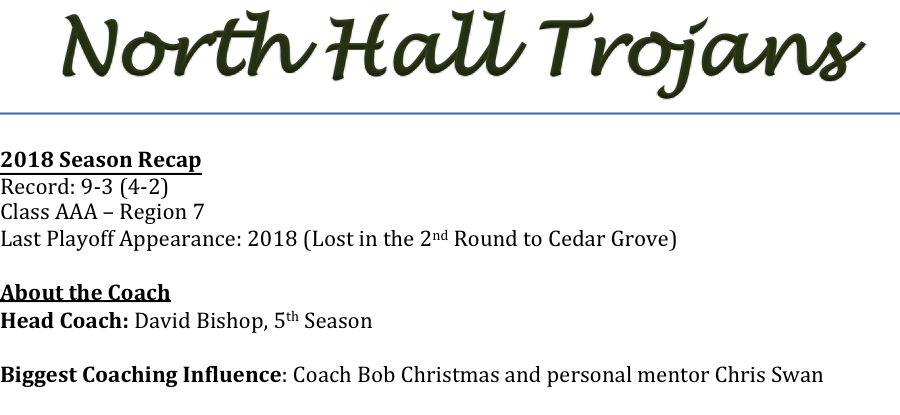 Coach David Bishop is in his 5th season as head coach for the North Hall Trojans. Coach Bishop has had the Trojans in the playoffs for the last four years. We asked him what his biggest challenge was as North Hall opens the 2019 season.