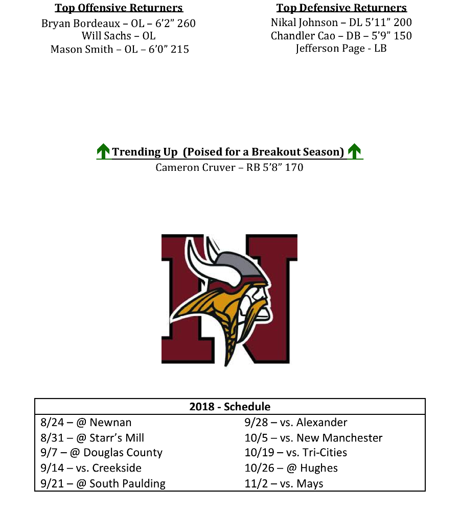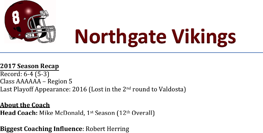 Coach Mike McDonald begins his first season as head coach for the Northgate Vikings this season. McDonald previously led both Union Grove and Newnan to playoff appearances in his 11 seasons as head coach. McDonald and the Northgate staff will have a big challenge right away.