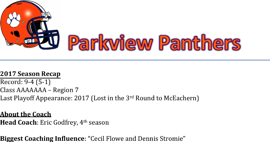 The Parkview Panthers enter the 2018 season with a “youthful, but talented offense” according to head coach Eric Godfrey. Coach Godfrey’s Panthers reached the quarterfinals last season. It was the team’s best finish in the past five years. This season the Panthers will be without All-State Honorable Mention QB Fred Payton and 2nd team All-State RB Christian Mallory.