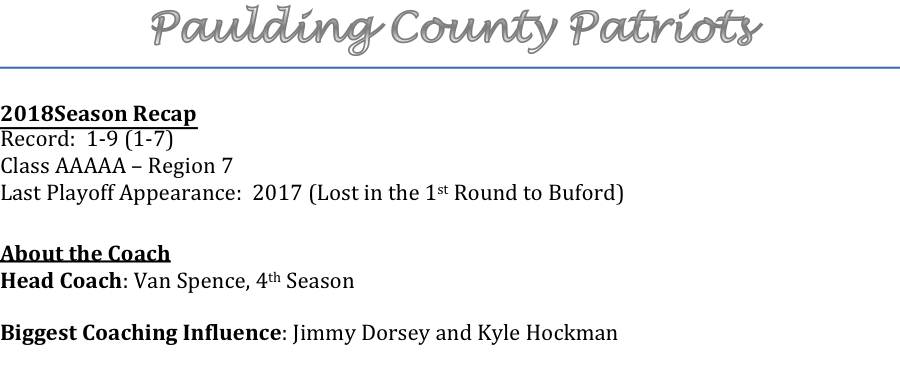 Coach Van Spence is at the helm for the Paulding County Patriots for his 4th season. As year 4 approaches, we asked Coach Spence what some of the challenges were for his team in 2019.