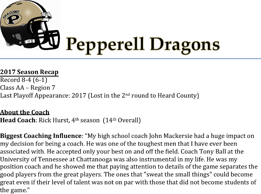Among those lost to graduation were All-Region offensive player of the year and All-State Honorable Mention QB Trevor Thomas and All-Region First Team selection Tae Hammond. Camron Miles is slated to be the heir apparent for the Dragons in the backfield. Miles was a Second Team All-Region selection for Coach Hurst and the Dragons. Miles is a two-way player who currently holds an offer from the Air Force Academy.